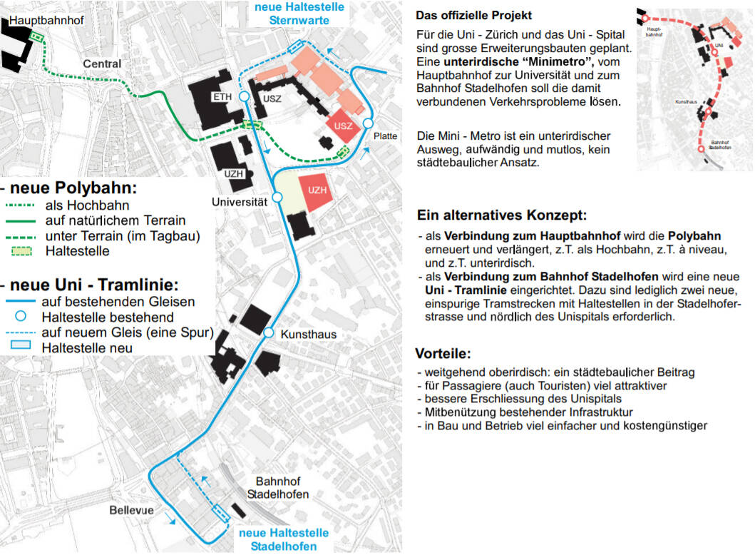 Für das alternative Konzept besteht eine ausführliche Machbarkeitsstudie von April 2019 mit Situationsplänen, Längenprofil, Fahrplanstudie, Skizzen etc. Gut gestaltet ist die Hochbahn vom Hauptbahnhof zum Central keine Beeinträchtigung des Stadtbildes, sondern eine Aufwertung und Bereicherung.