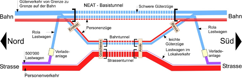 - Der NEAT–Basistunnel wird bestimmungsgemäss primär für den Güterverkehr genutzt. Auch die 500‘000 Lastwagen, die am Gotthard noch zulässig sind, werden zwischen Erstfeld und Biasca auf einer rollenden Strasse für Lastwagen durch den Tunnel transportiert.